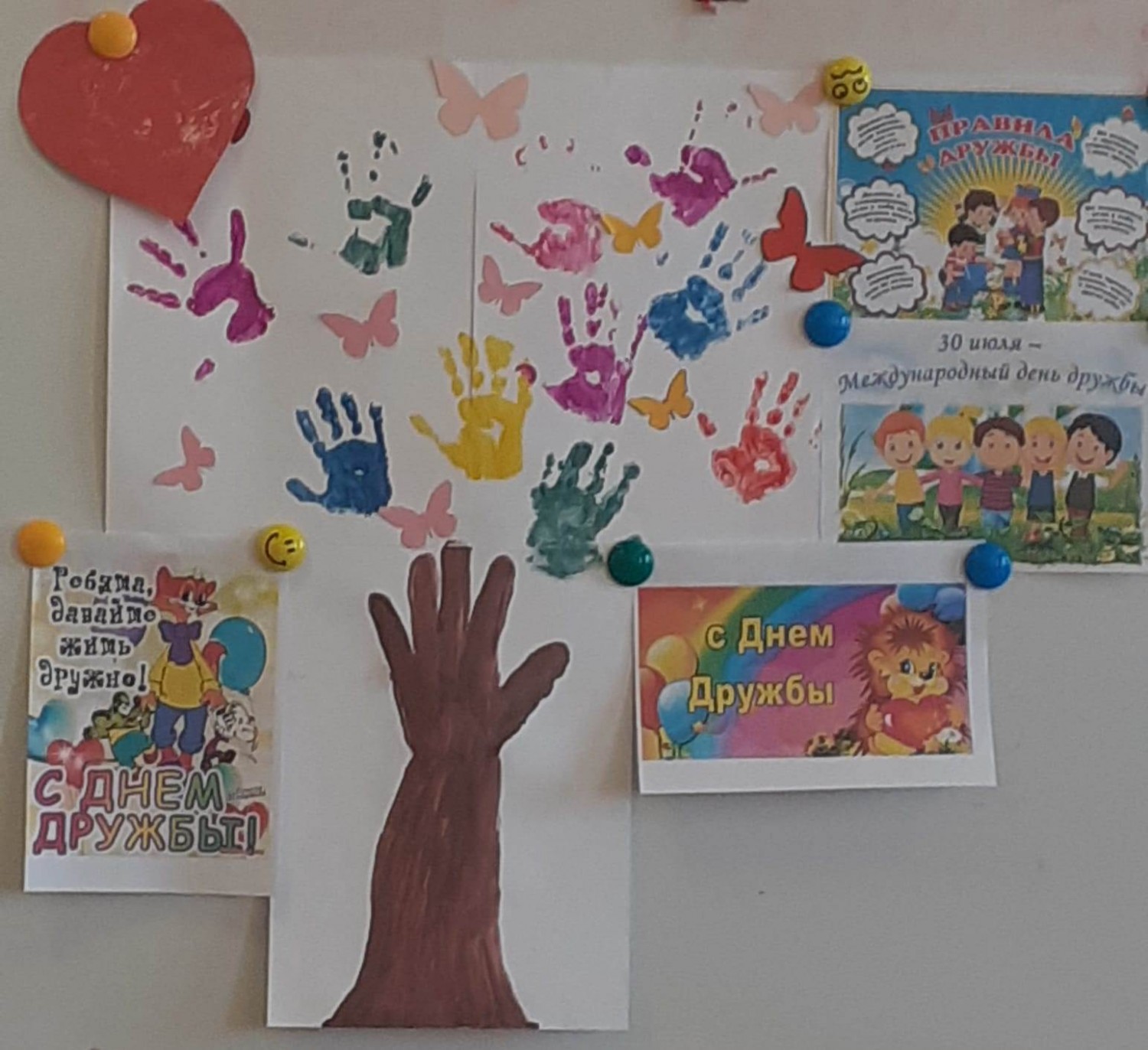 30 июля отмечается "Международный день дружбы". Дружеские чувства позволяют объединиться людям, получить опору, а также поддержку в новых начинаниях и свершениях. О таком прекрасном чувстве и людях, способных дружить, и напоминает праздник международного масштаба – Всемирный день дружбы. Дружба - одно из главенствующих чувств, связывающих людей. О дружбе написаны книги, сложены песни, стихотворения. В группе "Фиксики" 30 июля прошло тематическое занятие «День дружбы». Цель: формирование у детей представлений о доброте, радости, дружеских взаимоотношениях, создание положительного эмоционального настроя у дошкольников. Наше занятие началось с беседы «Что такое дружба?», «Для чего нужны друзья?» Ребята играли в игры "Назови друга ласково", "Что такое хорошо-что такое плохо". В ходе нашего занятия мы с ребятами пришли к выводу, что детский сад и все ребята -это наши друзья. Ребята решили для себя, что дружить может только тот, кто всегда улыбается и имеет доброе сердце. Дети с большим удовольствием играли в игру «Подари улыбку другу» и с радостью поделились добрым сердцем. Дети смотрели мультики про настоящую дружбу, слушали песенки. Итогом нашего занятия стала коллективная аппликация «Дерево дружбы»
