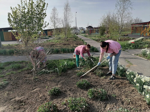 На территории детского сада родители высадили деревья, кусты, цветы, показав детям пример озеленения окружающей среды и заботы о растениях.